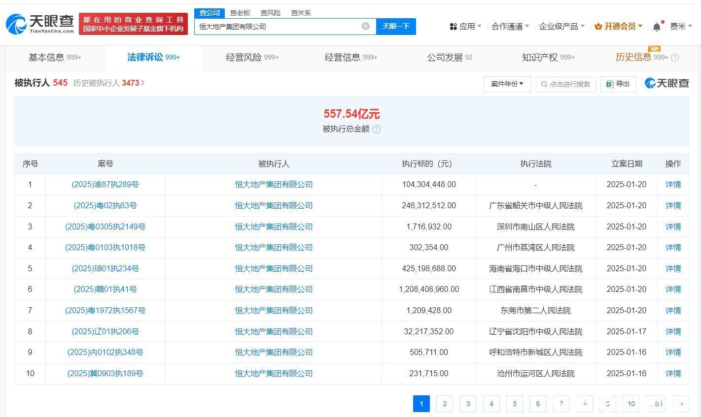天眼风险信息显示,恒大地产集团有限公司现存540余条被执行人信息,被执行总金额超557亿元。此外,该公司还存在多条限制消费令、失信被执行人(老赖)及终本案件信息。